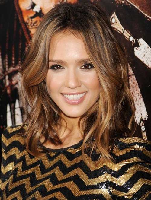 Here is a layered mid length hairstyle with highlights, her hair would be much more easy to style since she has thick hair texture.