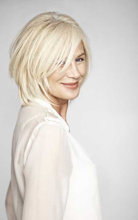 Really stylish short hair cut for older ladies! Layered side bangs and short to mid cut: