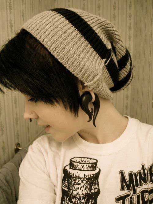 Her multiple hair color and edgy short hairstyle emphasize her emo style.