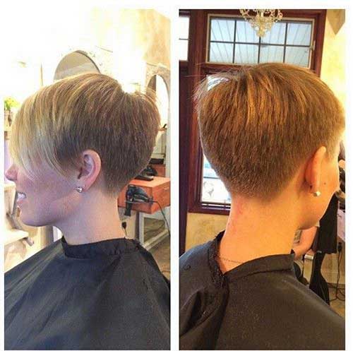 Shorter back and long blonde bangs add a cool and stylish look to this hairstyle.