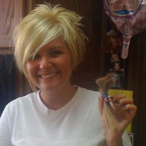 This platinum blonde cute hairstyle with choppy layers and bangs nicely frames her face.